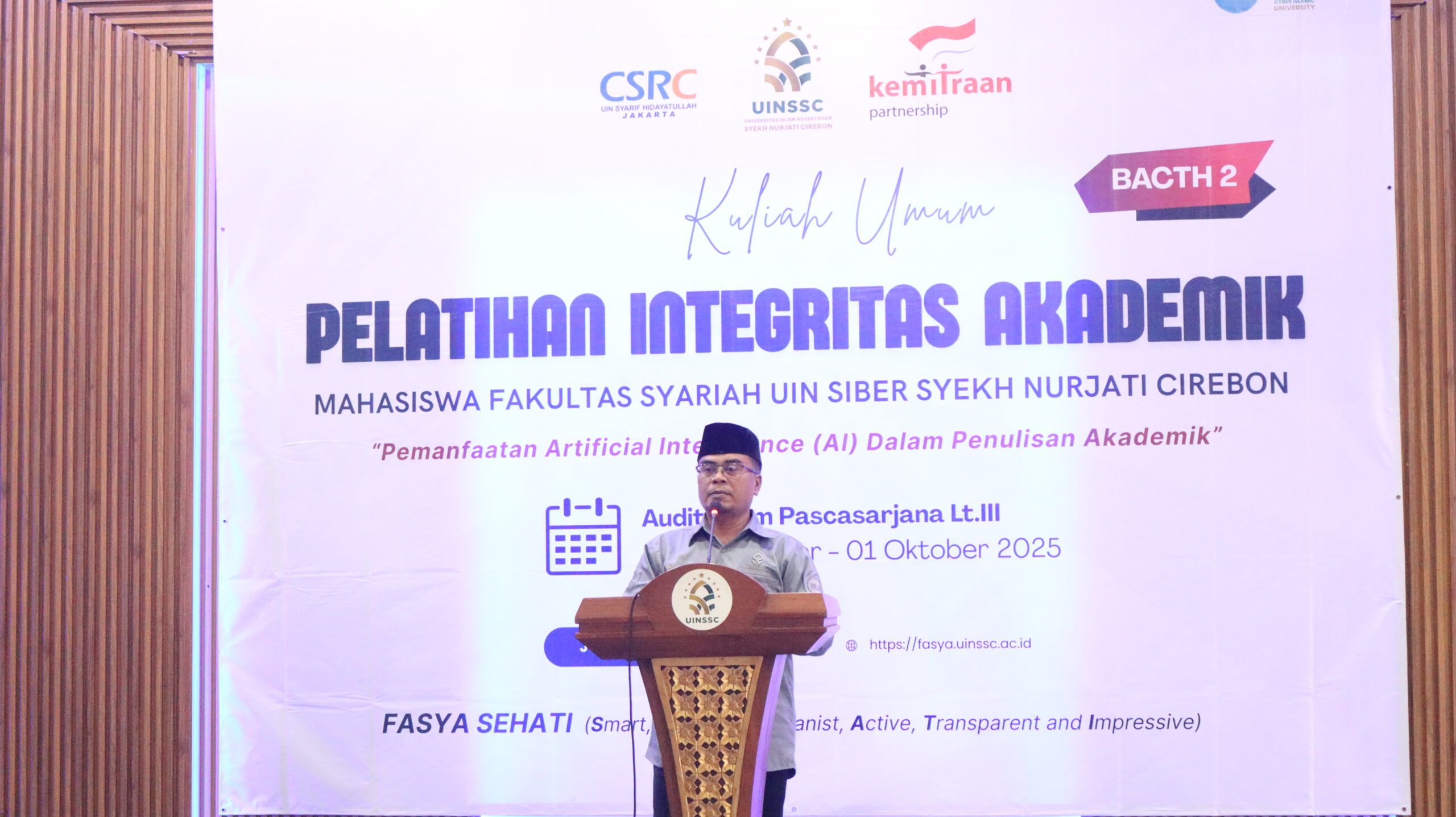 Fakultas Syariah UIN Siber Syekh Nurjati Cirebon sukses menyelenggarakan Pelatihan Integris Akademik bagi Mahasiswa Semester 1, kegiatan ini dilaksakanan pada tanggal 30 September-01 Oktober 2025 bertempat di Auditorium Pascasarjana Lt.III. Kegiatan ini bekerjasama dengan Center for the Study of Religion and Culture (CSRC) UIN Syarif Hidayatullah Jakarta. Kegiatan ini bertujuan untuk memahami dampak dan sanksi plagiarisme, dapat meningkatkan keterampilan menulis akademik serta etika dan batasan penggunaan AI dalam penulisan akademik;